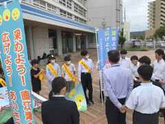 その後、直江津駅前に移動。ちょうどあいさつ運動が終わるところでした。直江津南小、直江津中等教育学校の皆さんも参加してくれ、一大あいさつ隊となって活気がありました。 明日は、職場体験を終えた2年生も参加します。最終日も元気を与えてくださいね。