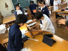 11月6日(木)、上越市教育委員会の指導主事先生にお越しいただき、生徒の皆さんが今以上にワクワクしながら学ぶにはどうしたら良いかの研修を行いました。画像は、技術の授業の様子です。課題は、A4版用紙1枚で、最強のペーパーブリッジを作ること。紙をギザギザに折ったり、四角に折ったり、丸めたりしながら、どうすると一番強度が上がるか考えました。作成したブリッジに重りをつるし、その様子をタブレットで撮影しました。ワクワクして学ぶ姿が見られました。