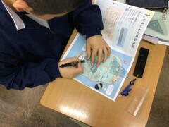 12月10日(水)、近隣の小・中・高等学校の先生にお越しいただき、数学の授業公開を行いました。公開したのは、いつも元気いっぱいの1年3組。平面図形の学習の始まりの場面で、教科書に掲載の地図から宝の位置を探し当てるという内容でした。感心したのは、宝の位置を探そうと悩みながらも30分以上集中して取り組んでいたことです。また、自分の気付いた考えが正しいのか仲間に相談する姿、ゴールへの見通しが持てなくなり仲間に「教えて」と相談する姿が、あちこちで自然と起きたことにも感心しました。