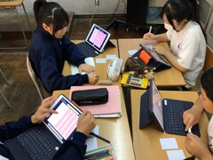 12月11日(木)、近隣の中学校の先生にお越しいただき、国語と部落問題学習の授業公開を行いました。国語は、昨日に引き続き元気いっぱいの1年3組。自分たちの生活と結びつけながら故事成語を考える内容で、故事成語の意味が分かる文を作り、かるたにする活動でした。活動する時間がたっぷりとられ、グループで話し合いながら作成する姿がありました。