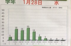 1年生の廊下に掲示されていました。これは、1月28日(水)の家庭学習時間を集計したものです。一人一台端末を利用し、各自がその日行った家庭学習時間を入力し、グラフにしています。1・2年生は、2月12日(木)に第3回定期テストがありますので、それに向けて今から皆で学習を頑張ろうという雰囲気づくりのために、学年主任さんが毎日掲示してくれています。この日は、2時間30分から3時間家庭学習した生徒は3人です。一番多かったのは1時間から1時間30分でした。自分の学習時間と仲間の頑張りを比較して、やる気スイッチを押していきましょう。