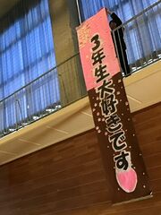 卒業式が、いよいよ明日になりました。今日は、1、2限に全校で予行練習を行いました。全校で集まるのはこれ1回きりでしたが、3年生も1・2年生も、「明日をいい式にしたい」という思いのこもった態度でした。順調に予行が終了し、最後に新生徒会から、3年生へのサプライズ企画が行われました。画像は、3年生のために作った垂れ幕です(明日の卒業式にも飾られます)。